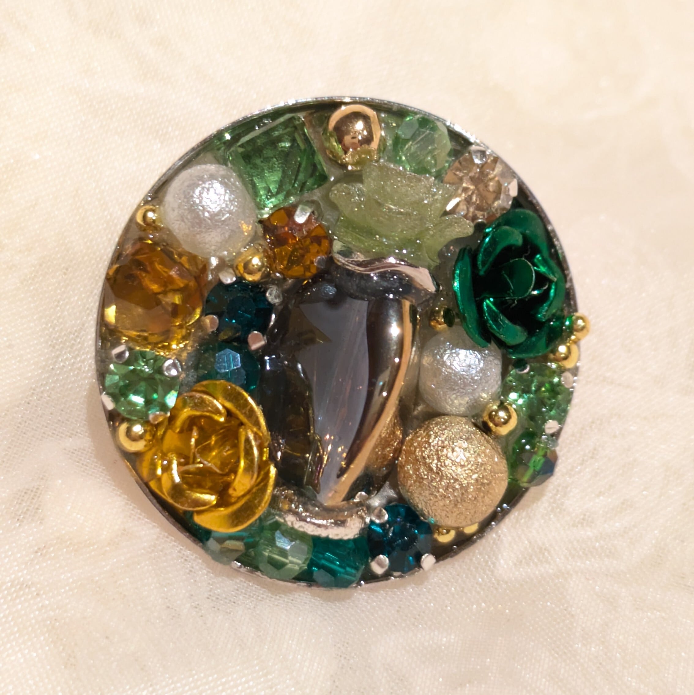 パールやアルミバラを贅沢に詰め込んだピンバッジ